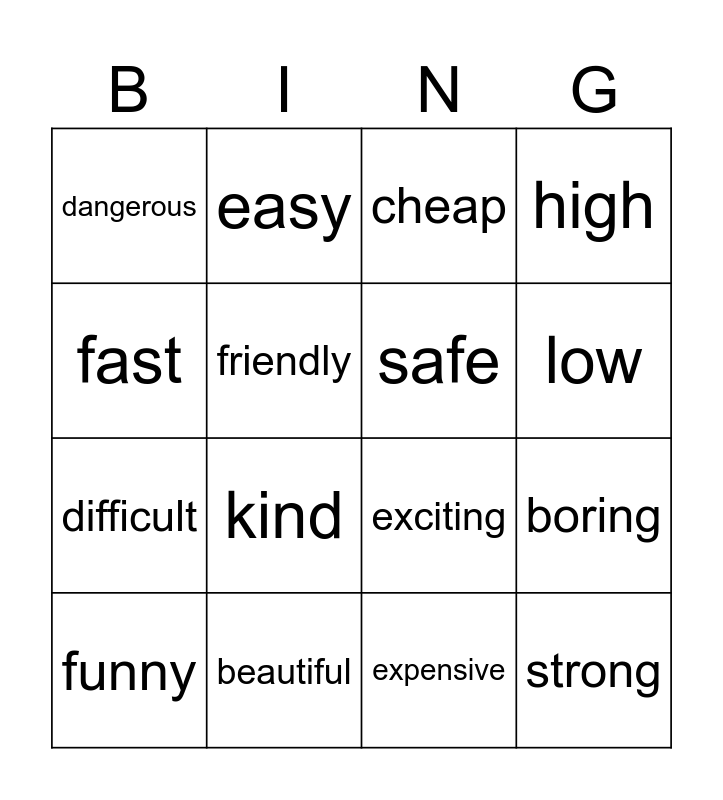This bingo card has 16 words: beautiful, boring, cheap, dangerous, difficult, easy, exciting, expensive, fast, friendly, funny, high, kind, low, safe and strong.