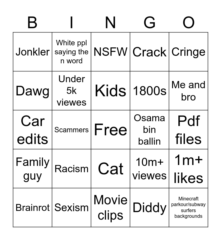 This bingo card has a free space and 24 words: Racism, Sexism, Kids, Brainrot, Cringe, Jonkler, Dawg, White ppl saying the n word, Osama bin ballin, Cat, 1800s, Car edits, 10m+ viewes, 1m+ likes, Under 5k viewes, Diddy, Pdf files, NSFW, Me and bro, Scammers, Minecraft parkour/subway surfers backgrounds, Family guy, Crack and Movie clips.