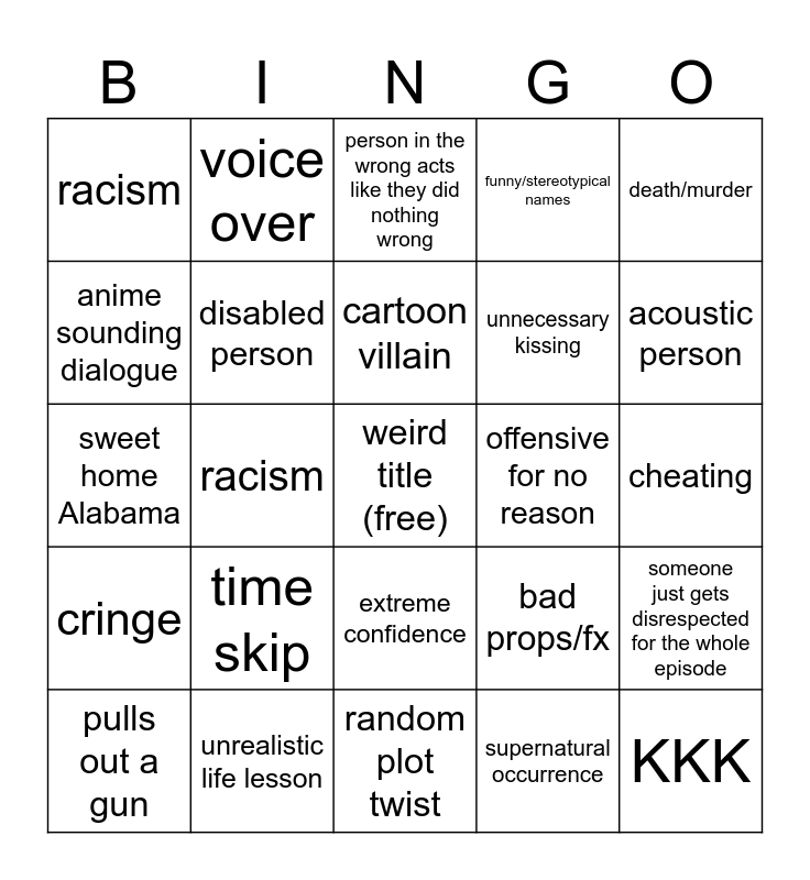 This bingo card has a free space and 24 words: time skip, unrealistic life lesson, cartoon villain, pulls out a gun, death/murder, racism, anime sounding dialogue, voice over, offensive for no reason, extreme confidence, unnecessary kissing, sweet home Alabama, bad props/fx, someone just gets disrespected for the whole episode, disabled person, supernatural occurrence, cheating, person in the wrong acts like they did nothing wrong, acoustic person, racism, KKK, cringe, funny/stereotypical names and random plot twist.