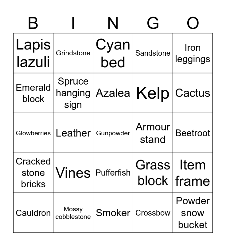 This bingo card has 25 words: Vines, Smoker, Azalea, Cauldron, Iron leggings, Lapis lazuli, Emerald block, Grindstone, Armour stand, Pufferfish, Kelp, Glowberries, Grass block, Item frame, Spruce hanging sign, Powder snow bucket, Beetroot, Cyan bed, Cactus, Leather, Gunpowder, Mossy cobblestone, Cracked stone bricks, Sandstone and Crossbow.