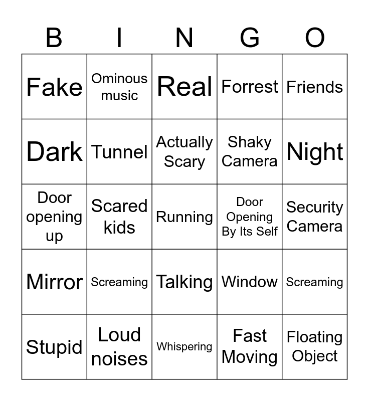This bingo card has a free space and 24 words: Screaming, Loud noises, Actually Scary, Stupid, Friends, Fake, Dark, Ominous music, Door Opening By Its Self, Talking, Shaky Camera, Door opening up, Window, Screaming, Tunnel, Fast Moving, Security Camera, Real, Night, Scared kids, Floating Object, Mirror, Forrest and Whispering.