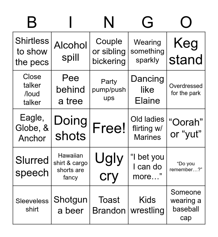 This bingo card has a free space and 24 words: Hawaiian shirt & cargo shorts are fancy, Shotgun a beer, Party pump/push ups, Sleeveless shirt, Keg stand, Shirtless to show the pecs, Close talker /loud talker, Alcohol spill, Old ladies flirting w/ Marines, Ugly cry, Dancing like Elaine, Eagle, Globe, & Anchor, “I bet you I can do more…”, “Do you remember…?”, Pee behind a tree, Kids wrestling, “Oorah” or “yut”, Couple or sibling bickering, Overdressed for the park, Doing shots, Someone wearing a baseball cap, Slurred speech, Wearing something sparkly and Toast Brandon.