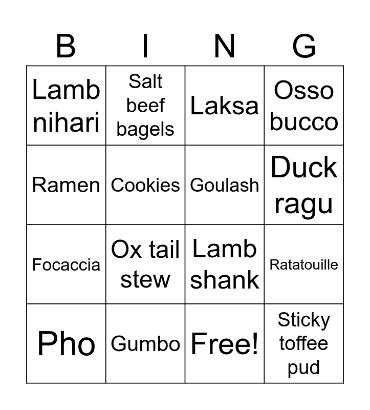 This bingo card has 17 words: Free!, Pho, Laksa, Lamb nihari, Ox tail stew, Osso bucco, Ratatouille, Goulash, Duck ragu, Cookies, Gumbo, Lamb shank, Ramen, Salt beef bagels, Focaccia, Chocolate cake and Sticky toffee pud.