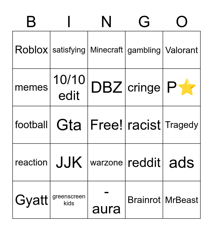 This bingo card has a free space and 24 words: Gyatt, JJK, DBZ, Brainrot, Valorant, Roblox, satisfying, Minecraft, racist, Tragedy, football, 10/10 edit, reddit, ads, memes, greenscreen kids, -aura, gambling, P⭐, reaction, Gta, warzone, cringe and MrBeast.