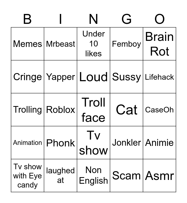 This bingo card has a free space and 24 words: Phonk, laughed at, Loud, Tv show with Eye candy, Brain Rot, Memes, Cringe, Mrbeast, Cat, Tv show, Sussy, Trolling, Jonkler, Animie, Yapper, Scam, CaseOh, Under 10 likes, Lifehack, Roblox, Asmr, Animation, Femboy and Non English.
