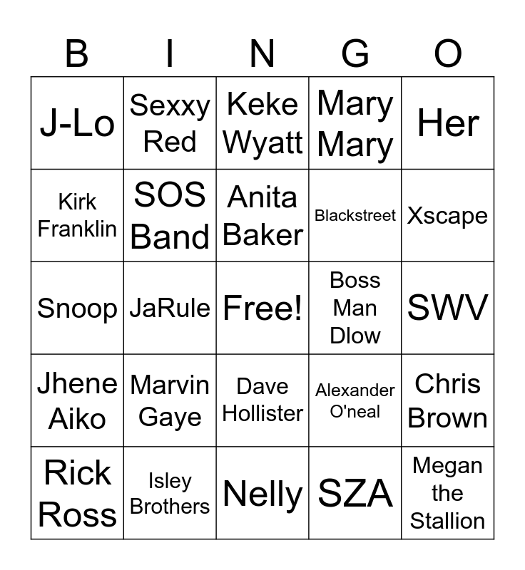 This bingo card has a free space and 64 words: Mary J Blige, Music Soulchild, Simply Redd, SZA, 50 cent, Summer Walker, Sexxy Red, Ashanti, Boss Man Dlow, Coco Jones, Jhene Aiko, Bobby Womack, Alexander O'neal, Her, Rich Homie Quan, SOS Band, Anita Baker, Mary Mary, Ari Lennox, Kirk Franklin, Isley Brothers, Dave Hollister, Blackstreet, Megan the Stallion, Ice Cube, Glorilla, GUY, R.Kelly, SWV, Rick Ross, Biggie Smalls, Whitney Houston, New Edition, Tupac, Snoop, Michael Jackson, Denise Williams, Maxwell, Temptations, J-Lo, JaRule, Nelly, So Freal, Tyereise, October London, Marvin Gaye, Teddy Pendergrass, Charlie Wilson, Xscape, Brownstone, Lo Key, J-Shin, Daniel Cesar, Chris Brown, Jazmine Sullivan, Da Brat, Keke Wyatt, Avant, Brandy, Monica, Queen Latifah, Kash Doll, Aaliyah and K Camp.