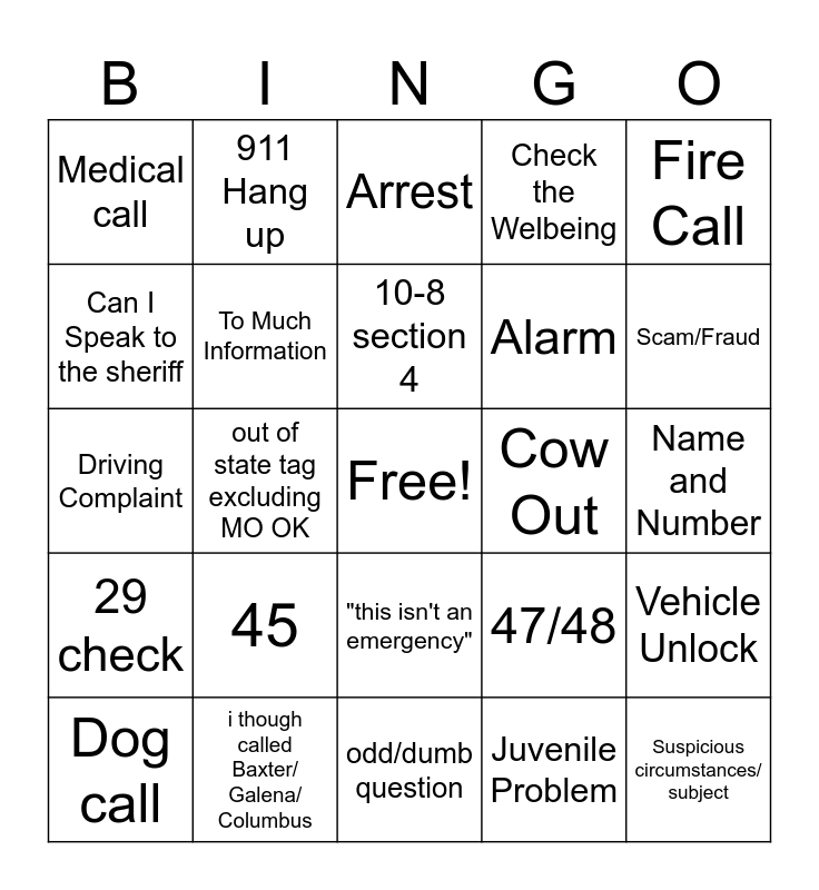 This bingo card has a free space and 24 words: 45, i though called Baxter/ Galena/ Columbus, 10-8 section 4, Dog call, Fire Call, Medical call, Can I Speak to the sheriff, 911 Hang up, Cow Out, "this isn't an emergency", Alarm, Driving Complaint, 47/48, Vehicle Unlock, To Much Information, Juvenile Problem, Name and Number, Arrest, Scam/Fraud, out of state tag excluding MO OK, Suspicious circumstances/ subject, 29 check, Check the Welbeing and odd/dumb question.