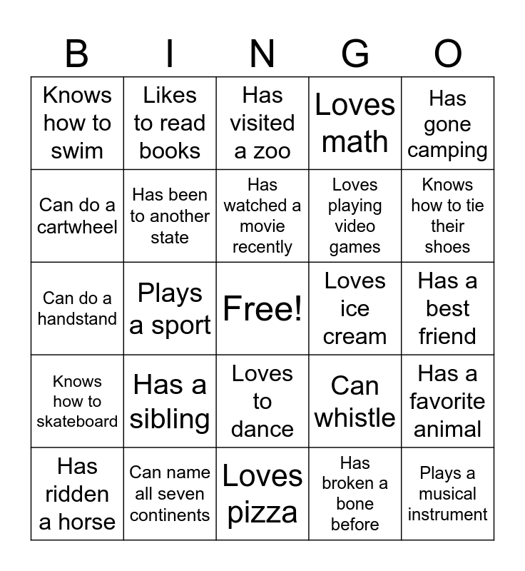 This bingo card has a free space and 50 words: Has a pet, Plays a musical instrument, Has been to the beach, Loves pizza, Has a sibling, Can ride a bike, Likes to read books, Has a favorite superhero, Can do a cartwheel, Likes to draw or paint, Has been to another state, Loves math, Has a favorite animal, Can whistle, Likes to sing, Has a garden or grows plants, Has watched a movie recently, Loves ice cream, Speaks more than one language, Has gone camping, Plays a sport, Has broken a bone before, Knows how to swim, Loves playing video games, Can bake or cook something, Has been on a plane, Knows how to tie their shoes, Can count to 100 in another language, Has visited a zoo, Loves to dance, Has a favorite video game, Has a birthday in the summer, Has a favorite color, Loves chocolate, Can name all seven continents, Has a favorite cartoon show, Can name all the planets in the solar system, Loves to play outside, Has been to a farm, Has a best friend, Likes dinosaurs, Has visited a museum, Likes to build with LEGO, Can do a magic trick, Has ridden a horse, Can do a handstand, Likes to tell jokes, Has a favorite superhero movie, Knows how to skateboard and Loves playing with puzzles.