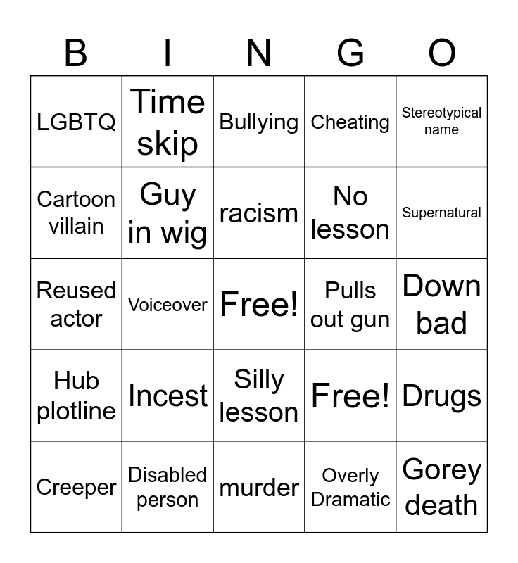 This bingo card has a free space and 25 words: Incest, murder, racism, Creeper, Stereotypical name, LGBTQ, Cartoon villain, Time skip, Pulls out gun, Silly lesson, No lesson, Reused actor, Free!, Drugs, Guy in wig, Bad Fx, Down bad, Bullying, Supernatural, Voiceover, Gorey death, Disabled person, Hub plotline, Cheating and Overly Dramatic.