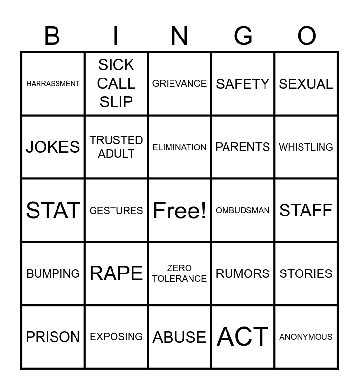 This bingo card has a free space and 24 words: PRISON, RAPE, ELIMINATION, ACT, SEXUAL, HARRASSMENT, SICK CALL SLIP, GRIEVANCE, OMBUDSMAN, STAFF, STAT, TRUSTED ADULT, RUMORS, STORIES, JOKES, EXPOSING, ABUSE, SAFETY, WHISTLING, BUMPING, GESTURES, ZERO TOLERANCE, PARENTS and ANONYMOUS.