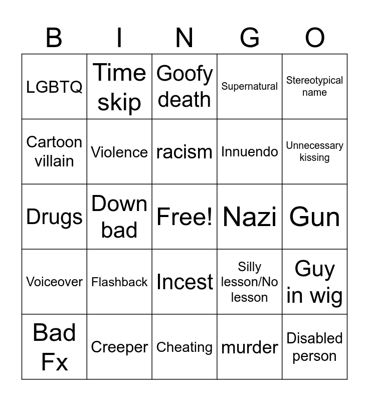 This bingo card has a free space and 26 words: Incest, murder, racism, Creeper, Stereotypical name, LGBTQ, Cartoon villain, Time skip, Gun, Silly lesson/No lesson, Innuendo, Drugs, Guy in wig, Bad Fx, Down bad, Bullying, Supernatural, Voiceover, Goofy death, Disabled person, Unnecessary kissing, Cheating, Nazi, Flashback, Violence and Diddy.