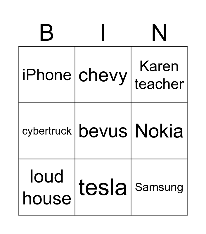 This bingo card has a free space and 8 words: Nokia, Karen teacher, chevy, loud house, iPhone, Samsung, cybertruck and tesla.