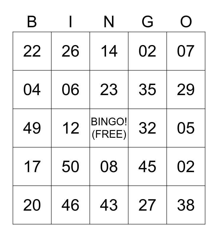 This bingo card has a free space and 24 words: 50, 46, 23, 20, 07, 22, 04, 26, 32, 08, 35, 49, 45, 02, 06, 27, 05, 14, 29, 12, 38, 17, 02 and 43.