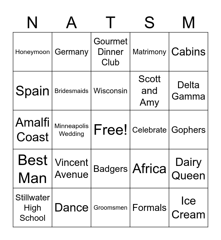 This bingo card has a free space and 42 words: Madison, Wisconsin, The Lodge, Vincent Avenue, Formals, Dairy Queen, Ice Cream, Dinner reservations, Gourmet Dinner Club, Badgers, Gophers, Delta Gamma, Minneapolis Wedding, Cabins, Travel, Africa, Seychelles, Amalfi Coast, Greece, Germany, Spain, Thailand, Croatia, Honeymoon, The Big Apple, Vows, Scott and Amy, Tunki and Robert, Sunroom Restaurant, Brothers, Maid of Honor, Best Man, Bridesmaids, Groomsmen, MIA, Stillwater High School, Dance, Celebrate, Ceremony, Flowers, Matrimony and Toasts.