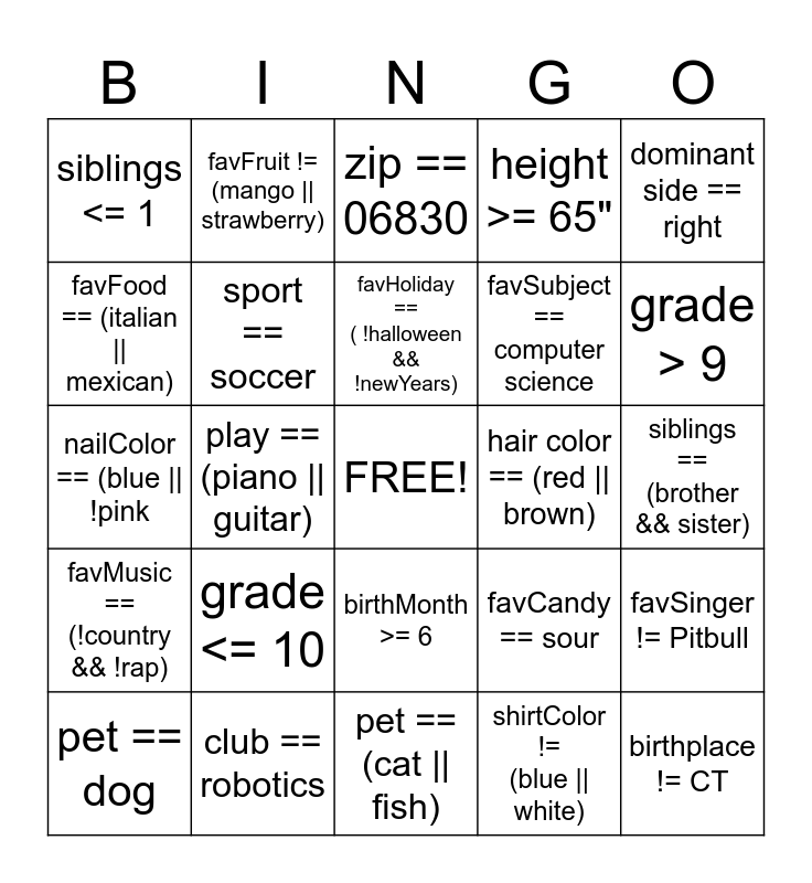 This bingo card has a free space and 29 words: pet == dog, eyeColor == blue, play == (piano || guitar), age >= 16, siblings <= 1, zip == 06830, sport == soccer, grade <= 10, hair color == (red || brown), club == robotics, siblings == (brother && sister), birthplace != CT, pet == (cat || fish), shirtColor != (blue || white), grade > 9, sport == field hockey, birthMonth >= 6, favMusic == (!country && !rap), dominant side == right, nailColor == (blue || !pink, favCandy == sour, (hairColor == brown) && (eyeColor != brown), favSubject == computer science, favFood == (italian || mexican), height >= 65", favFruit != (mango || strawberry), favSinger != Pitbull, favHoliday == ( !halloween && !newYears) and favColor == (green || yellow).