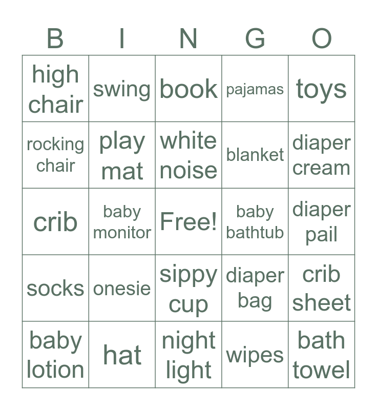 This bingo card has a free space and 35 words: bottle warmer, dresser, teethers, play mat, sippy cup, pajamas, rocking chair, carseat, white noise, burp cloth, crib, toys, bottle brush, stroller, high chair, baby bathtub, wipes, baby monitor, socks, bath towel, diaper bag, baby lotion, crib sheet, hat, book, diaper cream, baby shampoo, stuffed animal, blanket, diaper pail, bottle, night light, onesie, swing and bib.