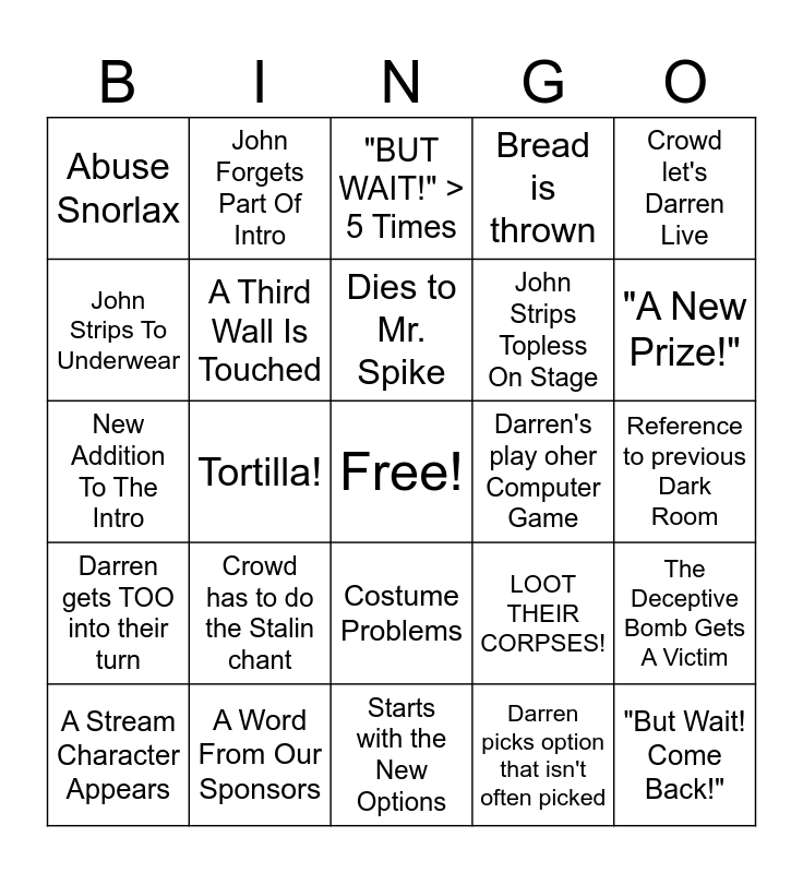 This bingo card has a free space and 36 words: Forgotten Decade in Intro, Darren doesn't say option precisely, No Soggy Bob in "Dark Lighthouse", A Third Wall Is Touched, LOOT THEIR CORPSES!, Darren gets TOO into their turn, Dies to Mr. Spike, No "Like a mugging...", Crowd let's Darren Live, Crowd Kills Darren, Tortilla!, Bread is thrown, Darren's play Board Game, Darren's play oher Computer Game, "A New Prize!", Abuse Snorlax, Shame!, Crowd has to do the Stalin chant, "But Wait! Come Back!", "BUT WAIT!" > 5 Times, Reference to previous Dark Room, The Deceptive Bomb Gets A Victim, A Word From Our Sponsors, A Stream Character Appears, Starts with the New Options, John Forgets Part Of Intro, New Addition To The Intro, Found the Light Switch...wires, John Strips Topless On Stage, John Strips To Underwear, Audient disrupts for Twitch Issues, John thinks Darren picked different option, Darren picks option that isn't often picked, Costume Problems, John Goes into Audience For Non-Game Reasons and John has to get audient to shush.