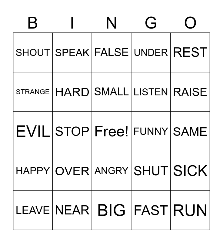 This bingo card has a free space and 25 words: OVER, BIG, SMALL, LEAVE, REST, SHOUT, STRANGE, SPEAK, FUNNY, ANGRY, LISTEN, EVIL, SHUT, SICK, HARD, SLEEPY, SAME, FALSE, RAISE, STOP, RUN, NEAR, HAPPY, UNDER and FAST.