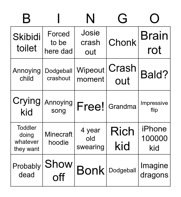 This bingo card has a free space and 24 words: Minecraft hoodie, Show off, Wipeout moment, Probably dead, Brain rot, Skibidi toilet, Annoying child, Forced to be here dad, Grandma, 4 year old swearing, Crash out, Crying kid, Rich kid, iPhone 100000 kid, Dodgeball crashout, Dodgeball, Impressive flip, Josie crash out, Bald?, Annoying song, Imagine dragons, Toddler doing whatever they want, Chonk and Bonk.