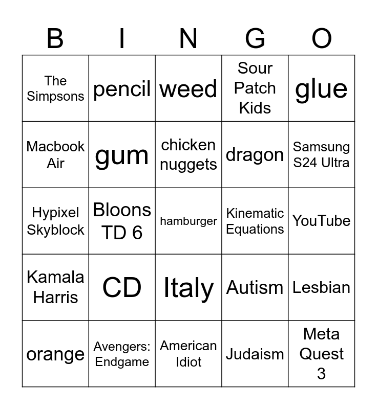 This bingo card has a free space and 24 words: CD, Avengers: Endgame, chicken nuggets, orange, glue, The Simpsons, Macbook Air, pencil, Kinematic Equations, Italy, dragon, Hypixel Skyblock, Autism, Lesbian, gum, Judaism, YouTube, weed, Samsung S24 Ultra, Bloons TD 6, Meta Quest 3, Kamala Harris, Sour Patch Kids and American Idiot.