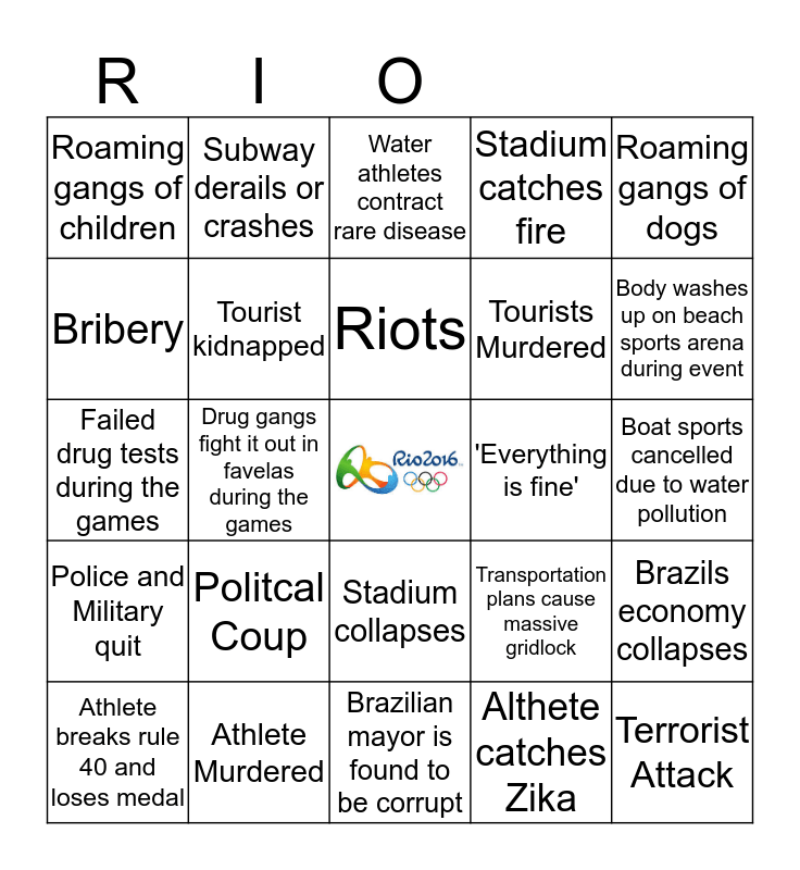 This bingo card has a free space and 24 words: Politcal Coup, Athlete Murdered, Riots, Athlete breaks rule 40 and loses medal, Roaming gangs of dogs, Roaming gangs of children, Bribery, Subway derails or crashes, 'Everything is fine', Stadium collapses, Tourists Murdered, Failed drug tests during the games, Transportation plans cause massive gridlock, Brazils economy collapses, Tourist kidnapped, Althete catches Zika, Boat sports cancelled due to water pollution, Water athletes contract rare disease, Body washes up on beach sports arena during event, Drug gangs fight it out in favelas during the games, Terrorist Attack, Police and Military quit, Stadium catches fire and Brazilian mayor is found to be corrupt.