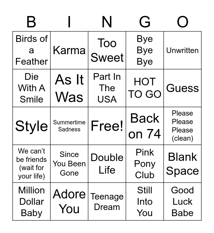 This bingo card has a free space and 37 words: I Will Always Love You, Drivers License, Baby, As It Was, Blank Space, Since You Been Gone, Part In The USA, Umbrella, Unwritten, Espresso, Summertime Sadness, Bye Bye Bye, Good Luck Babe, Please Please Please (clean), Die With A Smile, We can’t be friends (wait for your life), Apple, Too Sweet, Double Life, Back on 74, Birds of a Feather, Guess, Million Dollar Baby, Teenage Dream, California Girls, Still Into You, Karma, End of Beginning, Nonsense, Cruel Summer, Breaking Dishes, Adore You, Style, Pocketful of Sunshine, Pink Pony Club, HOT TO GO and Been Like This.