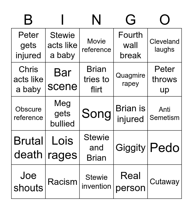 This bingo card has 25 words: Lois rages, Stewie invention, Brian tries to flirt, Joe shouts, Cleveland laughs, Peter gets injured, Chris acts like a baby, Stewie acts like a baby, Brian is injured, Stewie and Brian, Quagmire rapey, Obscure reference, Giggity, Pedo, Bar scene, Cutaway, Anti Semetism, Movie reference, Peter throws up, Meg gets bullied, Song, Racism, Brutal death, Fourth wall break and Real person.
