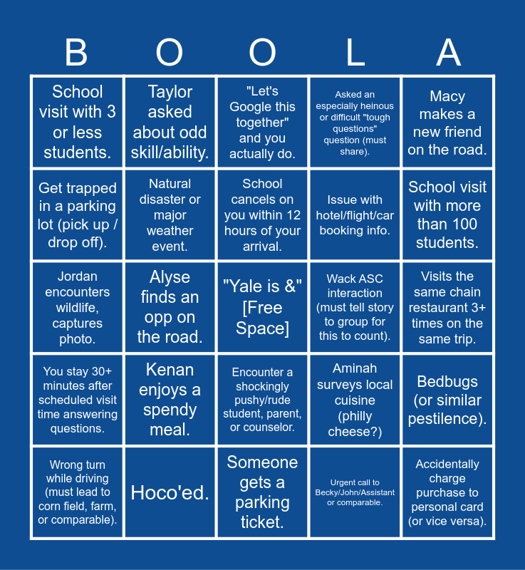 This bingo card has a free space and 24 words: Kenan enjoys a spendy meal., Hoco'ed., School cancels on you within 12 hours of your arrival., Wrong turn while driving (must lead to corn field, farm, or comparable)., Macy makes a new friend on the road., School visit with 3 or less students., Get trapped in a parking lot (pick up / drop off)., Taylor asked about odd skill/ability., Wack ASC interaction (must tell story to group for this to count)., Encounter a shockingly pushy/rude student, parent, or counselor., Issue with hotel/flight/car booking info., Jordan encounters wildlife, captures photo., Aminah surveys local cuisine (philly cheese?), Bedbugs (or similar pestilence)., Natural disaster or major weather event., Urgent call to Becky/John/Assistant or comparable., Visits the same chain restaurant 3+ times on the same trip., "Let's Google this together" and you actually do., School visit with more than 100 students., Alyse finds an opp on the road., Accidentally charge purchase to personal card (or vice versa)., You stay 30+ minutes after scheduled visit time answering questions., Asked an especially heinous or difficult "tough questions" question (must share). and Someone gets a parking ticket..