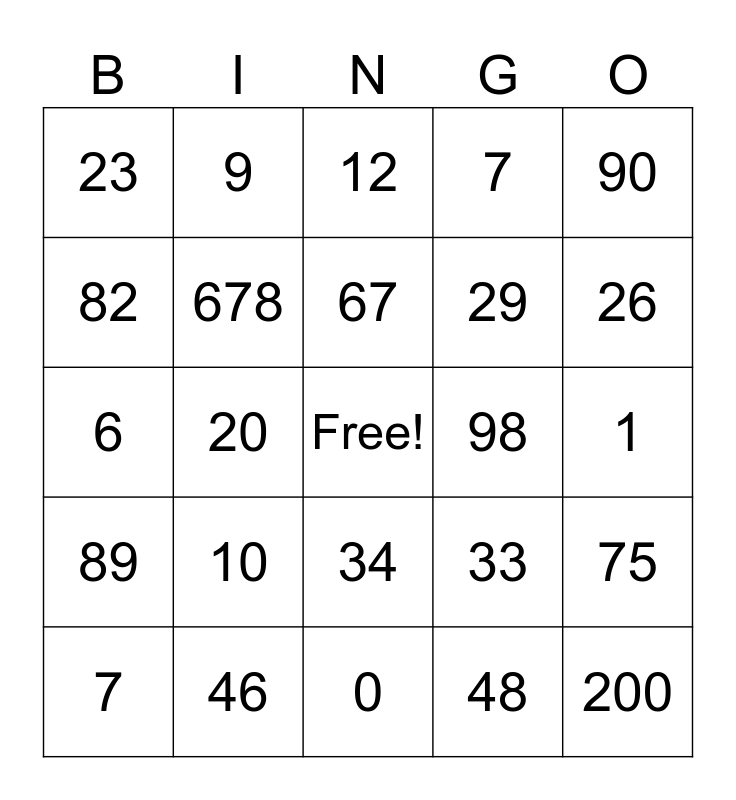 This bingo card has a free space and 24 words: 10, 46, 67, 7, 90, 23, 82, 9, 98, 34, 29, 6, 33, 75, 678, 48, 1, 12, 26, 20, 200, 89, 7 and 0.