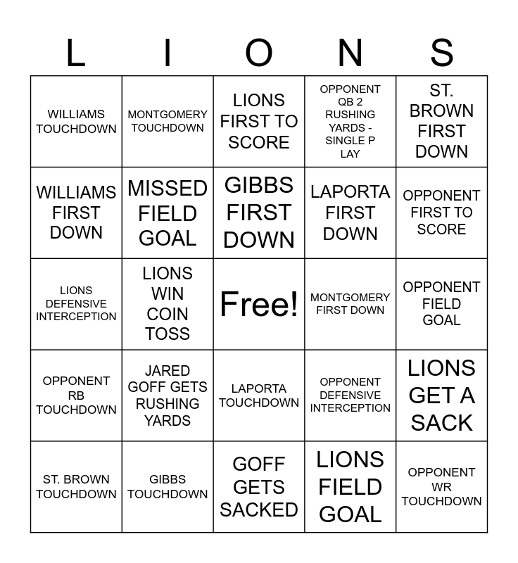 This bingo card has a free space and 24 words: JARED GOFF GETS RUSHING YARDS, GIBBS TOUCHDOWN, GIBBS FIRST DOWN, ST. BROWN TOUCHDOWN, ST. BROWN FIRST DOWN, WILLIAMS TOUCHDOWN, WILLIAMS FIRST DOWN, MONTGOMERY TOUCHDOWN, MONTGOMERY FIRST DOWN, LAPORTA TOUCHDOWN, LAPORTA FIRST DOWN, LIONS DEFENSIVE INTERCEPTION, OPPONENT DEFENSIVE INTERCEPTION, LIONS GET A SACK, MISSED FIELD GOAL, LIONS FIELD GOAL, OPPONENT FIELD GOAL, LIONS FIRST TO SCORE, OPPONENT FIRST TO SCORE, LIONS WIN COIN TOSS, OPPONENT WR TOUCHDOWN, OPPONENT RB TOUCHDOWN, OPPONENT QB 2 RUSHING YARDS - SINGLE PLAY and GOFF GETS SACKED.