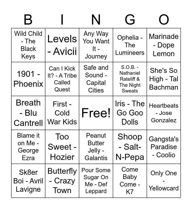This bingo card has a free space and 65 words: Humble - Kendrick Lamar, Can't Hold Us - Macklemore, Ryan Lewis, Candy Shop - 50 Cent, Gangsta's Paradise - Coolio, Ms. Jackson - Outkast, DJ Got Us Fallin' In Love - Usher, Pitbull, Levels - Avicii, Cheerleader - OMI, Felix Jason, Safe and Sound - Capital Cities, Happier - Marshmello, Bastille, Peanut Butter Jelly - Galantis, Chateau - Angus & Julia Stone, Heartbeats - Jose Gonzalez, Marinade - Dope Lemon, Strangers - Mt. Joy, 1901 - Phoenix, First - Cold War Kids, Wild Child - The Black Keys, Electric Feel - MGMT, S.O.B. - Nathaniel Rateliff & The Night Sweats, Too Sweet - Hozier, Blame it on Me - George Ezra, Ophelia - The Lumineers, HandClap - Fitz and The Tantrums, Semi-Automatic - Twenty One Pilots, Prayer of The Refugee - Rise Against, Boom - P.O.D., Still Waiting - Sum 41, Only One - Yellowcard, Over My Head (Cable Car) - The Fray, Sk8er Boi - Avril Lavigne, I Just Wanna Run - The Downtown Fiction, I'm Not Okay (I Promise) - My Chemical Romance, Can't Stop The World - The Go-Go's, Shoop - Salt-N-Pepa, Butterfly - Crazy Town, Miami - Will Smith, Breath - Blu Cantrell, Come Baby Come - K7, It Wasn't Me - Shaggy, Can I Kick It? - A Tribe Called Quest, Blinding Lights - The Weeknd, Iris - The Go Goo Dolls, Levitating - Dua Lipa, DaBaby, Viva La Vida - Coldplay, Kids - MGMT, She's So High - Tal Bachman, Waste a Moment - Kings of Leon, Jump - Van Halen, Only Wanna Be With You - Hootie & The Blowfish, We're Not Gonna Take It - Twisted Sister, Steal My Sunshine - Len, Play That Funky Music - Wild Cherry, Pour Some Sugar On Me - Def Leppard, Don't Go Breaking My Heart - Elton John, Who Are You - The Who, Edge of Seventeen. - Stevie Nicks, Any Way You Want It - Journey, How Bizarre - OMC, Dog Days Are Over - Florence + The Machine, Got My Mind Set On You - George Harrison, Friday I'm In Love - The Cure, Ways To Go - Grouplove, We Are The People - Empire of the Sun and Baiana - Bakermat.
