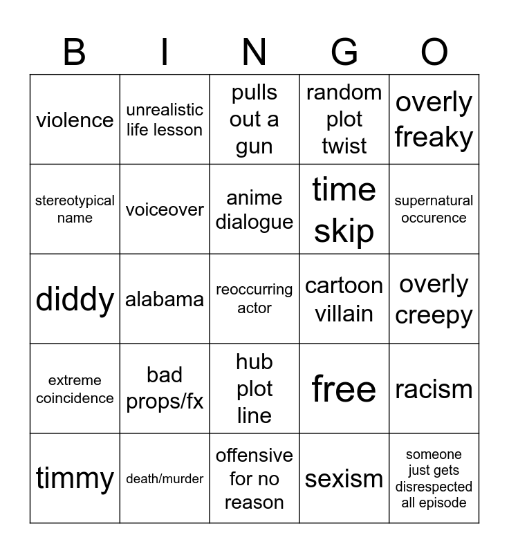 This bingo card has 25 words: bad props/fx, offensive for no reason, anime dialogue, timmy, overly freaky, violence, stereotypical name, unrealistic life lesson, cartoon villain, hub plot line, time skip, diddy, free, racism, voiceover, someone just gets disrespected all episode, overly creepy, pulls out a gun, supernatural occurence, alabama, reoccurring actor, death/murder, extreme coincidence, random plot twist and sexism.