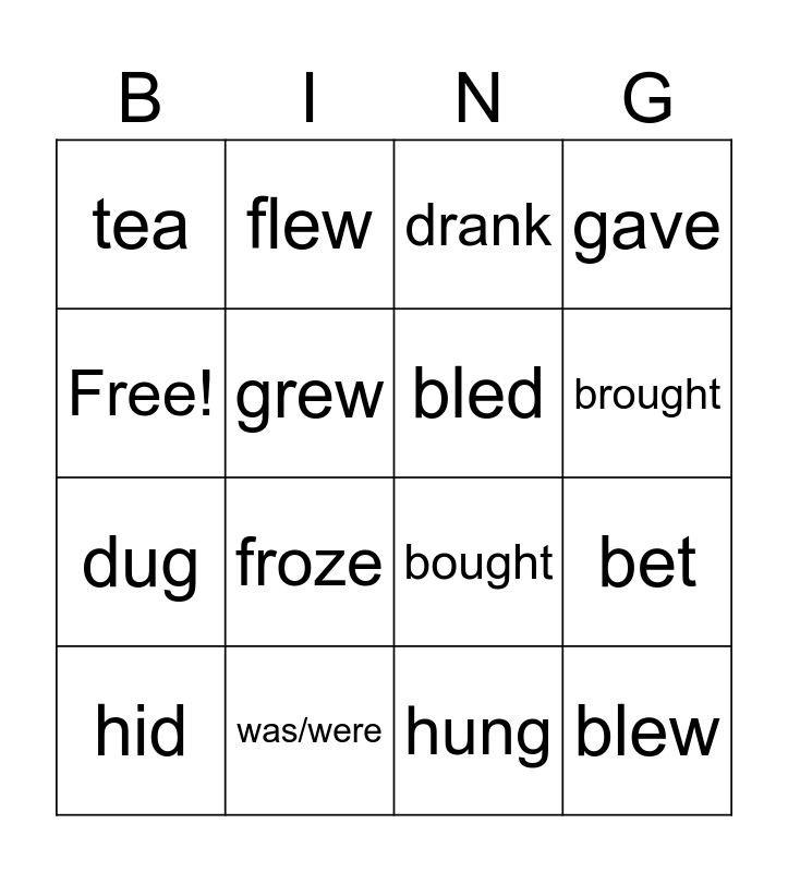 This bingo card has 16 words: was/were, bet, drank, tea, dug, flew, bought, hung, Free!, grew, hid, gave, froze, brought, bled and blew.
