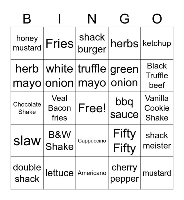 This bingo card has a free space and 59 words: tomato, lettuce, pickles, slaw, cherry pepper, rocket, white onion, shallots, green onion, red onion, herbs, cabbage, herb mayo, shack sauce, roasted garlic mayo, honey mustard, mustard, ketchup, mayo, truffle mayo, bbq sauce, shack burger, double shack, shack meister, RGM SNG, Shack Stack, Chicken Shack, Smoke Shack, Black Truffle beef, Black Truffle Chicken, Hot chicken, BBQ Chicken, Shroom Burger, Chicken bites, Fries, Cheese Fries, Shack Meister Fries, Veal Bacon fries, Vanilla Shake, Chocolate Shake, Red Velvet Shake, B&W Shake, Vanilla Cookie Shake, Strawberry Cheesecake Shake, VanChoc, Vanilla Cup, Chocolate Cup, Latte, Cappuccino, Americano, Espresso, Lemonade, Strawberry Mint, Iced Tea, Sweet Iced Tea, Fifty Fifty, Passionfruit Mojito, Raspberry Fizz and Blood orange breezer.
