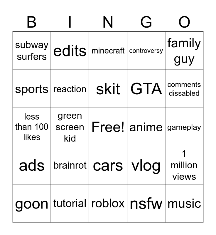 This bingo card has a free space and 24 words: brainrot, tutorial, skit, goon, family guy, subway surfers, sports, edits, anime, cars, GTA, less than 100 likes, vlog, 1 million views, reaction, nsfw, gameplay, minecraft, comments dissabled, green screen kid, music, ads, controversy and roblox.
