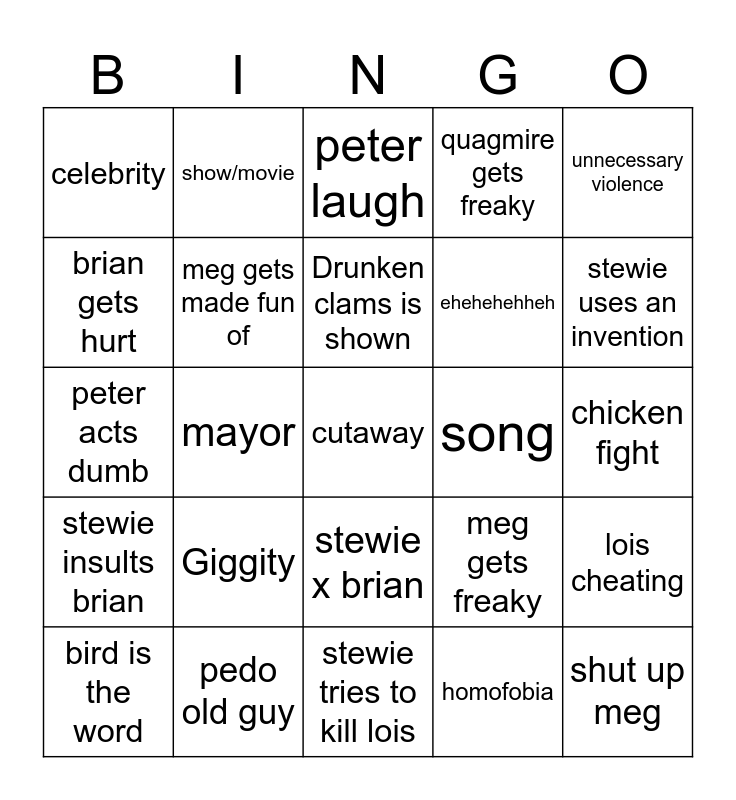 This bingo card has a free space and 24 words: Giggity, pedo old guy, Drunken clams is shown, bird is the word, unnecessary violence, celebrity, brian gets hurt, show/movie, song, stewie x brian, ehehehehheh, peter acts dumb, meg gets freaky, lois cheating, meg gets made fun of, homofobia, chicken fight, peter laugh, stewie uses an invention, mayor, shut up meg, stewie insults brian, quagmire gets freaky and stewie tries to kill lois.