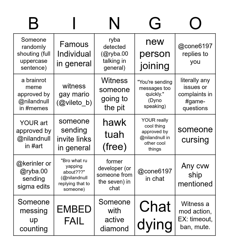 This bingo card has a free space and 24 words: Someone messing up counting, "Bro what ru yapping about???" (@nilandnull replying that to someone), Witness someone going to the pit, Chat dying, @cone6197 replies to you, Someone randomly shouting (full uppercase sentence), Famous Individual in general, ryba detected (@ryba.00 talking in general), YOUR really cool thing approved by @nilandnull in other cool things, someone cursing, YOUR art approved by @nilandnull in #art, witness gay mario (@vileto_b), @cone6197 in chat, Any cvw ship mentioned, a brainrot meme approved by @nilandnull in #memes, EMBED FAIL, Someone with active diamond, new person joining, literally any issues or complaints in #game-questions, @kerinler or @ryba.00 sending sigma edits, someone sending invite links in general, former developer (or someone from the seven) in chat, "You're sending messages too quickly." (Dyno speaking) and Witness a mod action, EX: timeout, ban, mute..