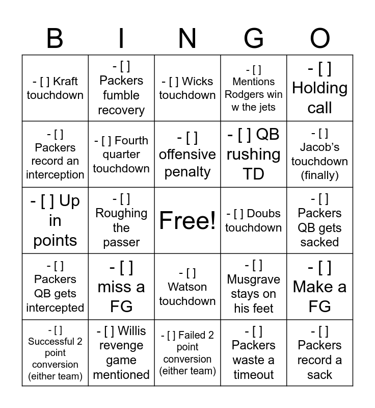 This bingo card has a free space and 37 words: - [ ] First quarter touchdown, - [ ] Second quarter touchdown, - [ ] Third quarter touchdown, - [ ] Fourth quarter touchdown, - [ ] Make a FG, - [ ] miss a FG, - [ ] offensive penalty, - [ ] Defensive penalty, - [ ] Holding call, - [ ] False start, - [ ] Roughing the passer, - [ ] Mentions Rodgers win w the jets, - [ ] Packers record a sack, - [ ] Packers QB gets sacked, - [ ] Packers record an interception, - [ ] Packers QB gets intercepted, - [ ] Reed touchdown, - [ ] Wicks touchdown, - [ ] Watson touchdown, - [ ] Doubs touchdown, - [ ] Kraft touchdown, - [ ] Jacob’s touchdown (finally), - [ ] Successful 2 point conversion (either team), - [ ] Failed 2 point conversion (either team), - [ ] Play challenged on the field (either team), - [ ] Packers waste a timeout, - [ ] Packers fumble recovery, - [ ] Bad call by ref, - [ ] Goes for fourth down (either team), - [ ] Packers win, - [ ] Packers lose, - [ ] Willis revenge game mentioned, - [ ] Up in points, - [ ] Down in points, - [ ] Musgrave stays on his feet, - [ ] QB rushing TD and - [ ] Drop a wide open pass.
