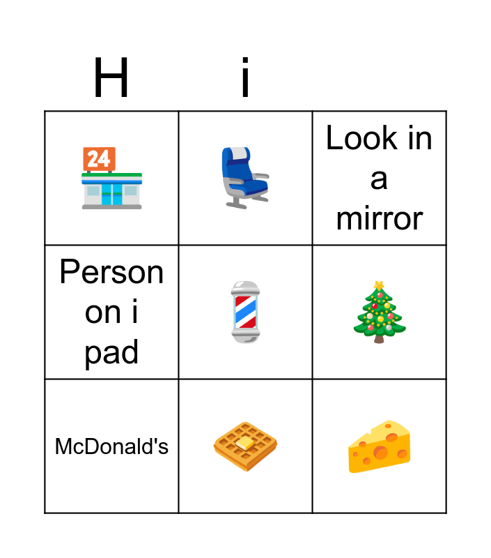 This bingo card has a free space and 26 words: đŽđ, đšī¸, đ§, đĨ, đ§, đĒ, đ, đē, Bad driver, Pink or purple Car, Yellow car, Look at someone for 15 seconds without them noticing, Green car, Give someone a hug, Someone on there phone not playing bingo, Fast food, Person on i pad, Make a reference someone doesn't get, Look in a mirror, Give Rhys money (please), Austin powers quote, Hi five, Tell someone "Horse" and don't elaborate, Kfc, McDonald's and Starbucks.