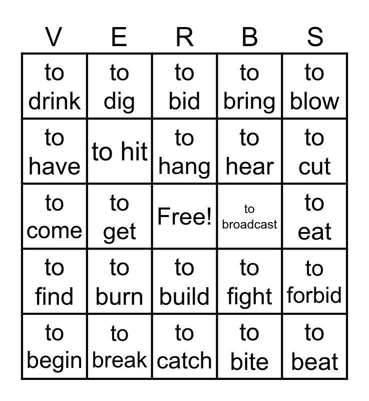 This bingo card has a free space and 43 words: to be, to beat, to become, to begin, to bet, to bite, to bid, to bleed, to blow, to break, to bring, to broadcast, to build, to burn, to buy, to catch, to choose, to come, to cost, to cut, to dig, to do, to draw, to drink, to drive, to eat, to fall, to feel, to fight, to find, to fly, to forbid, to forget, to get, to give, to go, to grow, to hang, to have, to hear, to hide, to hit and to hurt.