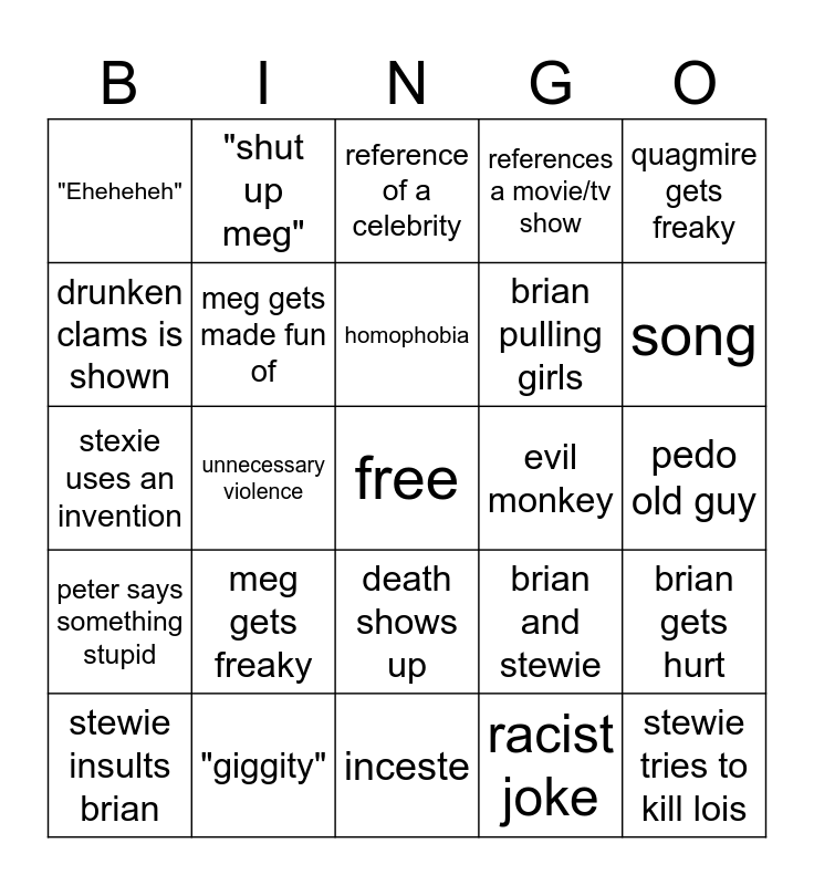 This bingo card has a free space and 24 words: meg gets freaky, "giggity", homophobia, stewie insults brian, quagmire gets freaky, "Eheheheh", drunken clams is shown, "shut up meg", evil monkey, death shows up, brian pulling girls, stexie uses an invention, brian and stewie, brian gets hurt, meg gets made fun of, racist joke, pedo old guy, reference of a celebrity, song, unnecessary violence, stewie tries to kill lois, peter says something stupid, references a movie/tv show and inceste.