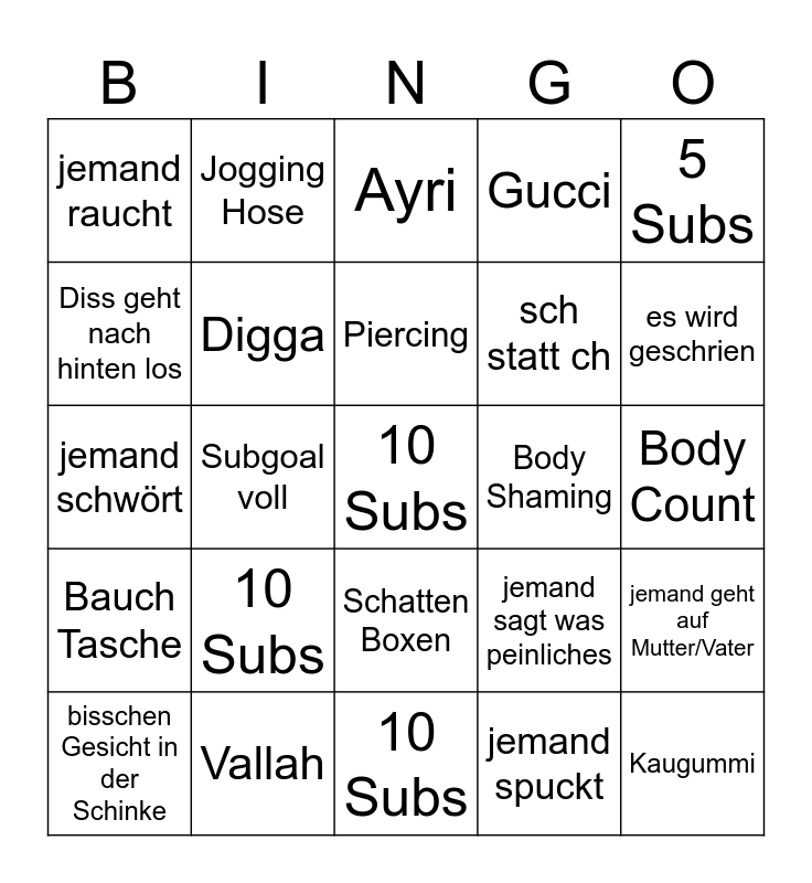 This bingo card has a free space and 24 words: 10 Subs, Vallah, Piercing, bisschen Gesicht in der Schinke, 5 Subs, jemand raucht, Diss geht nach hinten los, Jogging Hose, Body Shaming, Schatten Boxen, sch statt ch, jemand schwört, jemand sagt was peinliches, jemand geht auf Mutter/Vater, Digga, jemand spuckt, Body Count, Ayri, es wird geschrien, Subgoal voll, Kaugummi, Bauch Tasche, Gucci and 10 Subs.