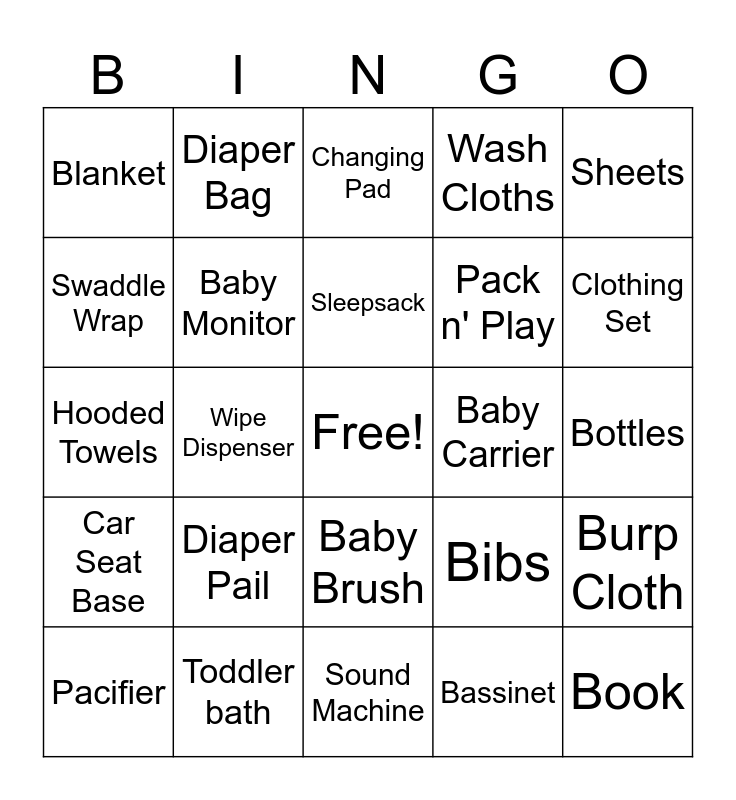 This bingo card has a free space and 28 words: Burp Cloth, Nursing Pillow, Pack n' Play, Bassinet, Swaddle Wrap, Changing Pad, Diaper Bag, Car Seat Base, Baby Carrier, Pacifier, Hooded Towels, Wash Cloths, Toddler bath, Sound Machine, Clothing Set, Activity Mat, Diaper Pail, Baby Monitor, Sleepsack, Baby Brush, Blanket, Stuffed Animal, Book, Wipe Dispenser, Bottles, Bibs, Sheets and Diapers.