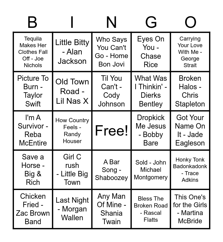 This bingo card has a free space and 87 words: Life Is A Highway - Tom Cochrane, Beat of the Music - Brett Eldredge, A Bar Song - Shaboozey, Stuck Like Glue - Sugarland, Fancy Like - Walker Hayes, This Kiss - Faith Hill, TEXAS HOLD 'EM - Beyoncé, The Devil Went Down to Georgia - The Charlie Daniels Band, Don't Let Our Love Start Slippin’ Away - Vince Gill, Heart Like A Truck - Lainey Wilson, You Make It Easy - Jason Aldean, Something Like That - Tim McGraw, Honky Tonk Badonkadonk - Trace Adkins, Got Your Name On It - Jade Eagleson, Walking In Memphis - Lonestar, Til You Can't - Cody Johnson, I Love a Rainy Night - Eddie Rabbitt, Crazy - Patsy Cline, Should've Been A Cowboy - Toby Keith, It's A Great Day To Be Alive - Travis Tritt, House Party - Sam Hunt, Stand by Your Man - Tammy Wynette, I'm A Survivor - Reba McEntire, East Bound and Down - Jerry Reed, Bless The Broken Road - Rascal Flatts, Dust On The Bottle - David Lee Murphy, That's My Kind Of Night - Luke Bryan, Homewrecker - Willow Avalon, Wanted - Hunter Hayes, Hey Driver - Zach Bryan, Last Night - Morgan Wallen, Achy Breaky Heart - Billy Ray Cyrus, Beautiful Crazy - Luke Combs, Girl Crush - Little Big Town, Picture To Burn - Taylor Swift, Boys 'Round Here - Blake Shelton, Broken Halos - Chris Stapleton, She's In Love With The Boy - Trisha Yearwood, People Are Crazy - Billy Currington, How Country Feels - Randy Houser, Fishin' in the Dark - Nitty Gritty Dirt Band, Goodbye Earl - The Chicks, Stronger Beer - Tim Hicks, Dropkick Me Jesus - Bobby Bare, Mud on the Tires - Brad Paisley, Carrying Your Love With Me - George Strait, Jackson - Johnny Cash, Little Bitty - Alan Jackson, Before He Cheats - Carrie Underwood, Look What God Gave Her - Thomas Rhett, Take Me Home Country Roads - John Denver, Big Iron - Marty Robbins, Save a Horse - Big & Rich, Wagon Wheel - Darius Rucker, She's No Lady - Lyle Lovett, 9 to 5 - Dolly Parton, What Was I Thinkin' - Dierks Bentley, Written in the Sand - Old Dominion, Boot Scootin' Boogie - Brooks & Dunn, Eyes On You - Chase Rice, Old Town Road - Lil Nas X, Your Man - Josh Turner, Friends in Low Places - Garth Brooks, 10 000 Hours - Dan + Shay, Springsteen - Eric Church, When You Say Nothing at All - Keith Whitley, Hey Good Lookin' - Hank Williams, Chicken Fried - Zac Brown Band, This One's for the Girls - Martina McBride, Redneck Woman - Gretchen Wilson, Forever and Ever Amen - Randy Travis, I'm in a Hurry - Alabama, Who Says You Can't Go - Home Bon Jovi, Sold - John Michael Montgomery, This Is My Dirt - Justin Moore, Heads Carolina Tails California - Jo Dee Messina, Sun Darts - Letterkenny, Any Man Of Mine - Shania Twain, The Gambler - Kenny Rogers, Guitars Cadillacs - Dwight Yoakam, Meant to Be - Bebe Rexha, When the Sun Goes Down - Kracker, Sweet Home Alabama - Lynyrd Skynyrd, Louisiana Woman Mississippi Man - Conway Twitty, Somebody Like You - Keith Urban, Tequila Makes Her Clothes Fall Off - Joe Nichols and Pour Me A Drink - Post Malone.