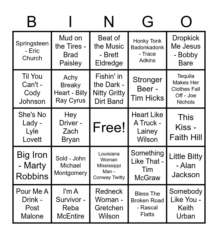 This bingo card has a free space and 87 words: Wagon Wheel - Darius Rucker, Friends in Low Places - Garth Brooks, Louisiana Woman Mississippi Man - Conway Twitty, Beautiful Crazy - Luke Combs, Sweet Home Alabama - Lynyrd Skynyrd, Take Me Home Country Roads - John Denver, Broken Halos - Chris Stapleton, Don't Let Our Love Start Slippin’ Away - Vince Gill, This Is My Dirt - Justin Moore, Guitars Cadillacs - Dwight Yoakam, It's A Great Day To Be Alive - Travis Tritt, Picture To Burn - Taylor Swift, Little Bitty - Alan Jackson, This Kiss - Faith Hill, Look What God Gave Her - Thomas Rhett, Fishin' in the Dark - Nitty Gritty Dirt Band, Sun Darts - Letterkenny, Stuck Like Glue - Sugarland, When You Say Nothing at All - Keith Whitley, Any Man Of Mine - Shania Twain, East Bound and Down - Jerry Reed, Heads Carolina Tails California - Jo Dee Messina, She's No Lady - Lyle Lovett, A Bar Song - Shaboozey, Bless The Broken Road - Rascal Flatts, You Make It Easy - Jason Aldean, I'm in a Hurry - Alabama, Homewrecker - Willow Avalon, Last Night - Morgan Wallen, Eyes On You - Chase Rice, I'm A Survivor - Reba McEntire, How Country Feels - Randy Houser, TEXAS HOLD 'EM - Beyoncé, Sold - John Michael Montgomery, Til You Can't - Cody Johnson, What Was I Thinkin' - Dierks Bentley, Tequila Makes Her Clothes Fall Off - Joe Nichols, Dust On The Bottle - David Lee Murphy, Got Your Name On It - Jade Eagleson, Hey Driver - Zach Bryan, Walking In Memphis - Lonestar, Boys 'Round Here - Blake Shelton, Your Man - Josh Turner, Heart Like A Truck - Lainey Wilson, She's In Love With The Boy - Trisha Yearwood, Dropkick Me Jesus - Bobby Bare, Goodbye Earl - The Chicks, Mud on the Tires - Brad Paisley, Fancy Like - Walker Hayes, Boot Scootin' Boogie - Brooks & Dunn, Carrying Your Love With Me - George Strait, Chicken Fried - Zac Brown Band, Big Iron - Marty Robbins, 10 000 Hours - Dan + Shay, Stand by Your Man - Tammy Wynette, Girl Crush - Little Big Town, Stronger Beer - Tim Hicks, Hey Good Lookin' - Hank Williams, When the Sun Goes Down - Kracker, Honky Tonk Badonkadonk - Trace Adkins, Achy Breaky Heart - Billy Ray Cyrus, The Devil Went Down to Georgia - The Charlie Daniels Band, 9 to 5 - Dolly Parton, That's My Kind Of Night - Luke Bryan, Forever and Ever Amen - Randy Travis, Crazy - Patsy Cline, Old Town Road - Lil Nas X, Pour Me A Drink - Post Malone, Somebody Like You - Keith Urban, I Love a Rainy Night - Eddie Rabbitt, House Party - Sam Hunt, Who Says You Can't Go - Home Bon Jovi, Beat of the Music - Brett Eldredge, Something Like That - Tim McGraw, Written in the Sand - Old Dominion, Wanted - Hunter Hayes, Before He Cheats - Carrie Underwood, Redneck Woman - Gretchen Wilson, People Are Crazy - Billy Currington, Jackson - Johnny Cash, Should've Been A Cowboy - Toby Keith, The Gambler - Kenny Rogers, Life Is A Highway - Tom Cochrane, Save a Horse - Big & Rich, Meant to Be - Bebe Rexha, Springsteen - Eric Church and This One's for the Girls - Martina McBride.