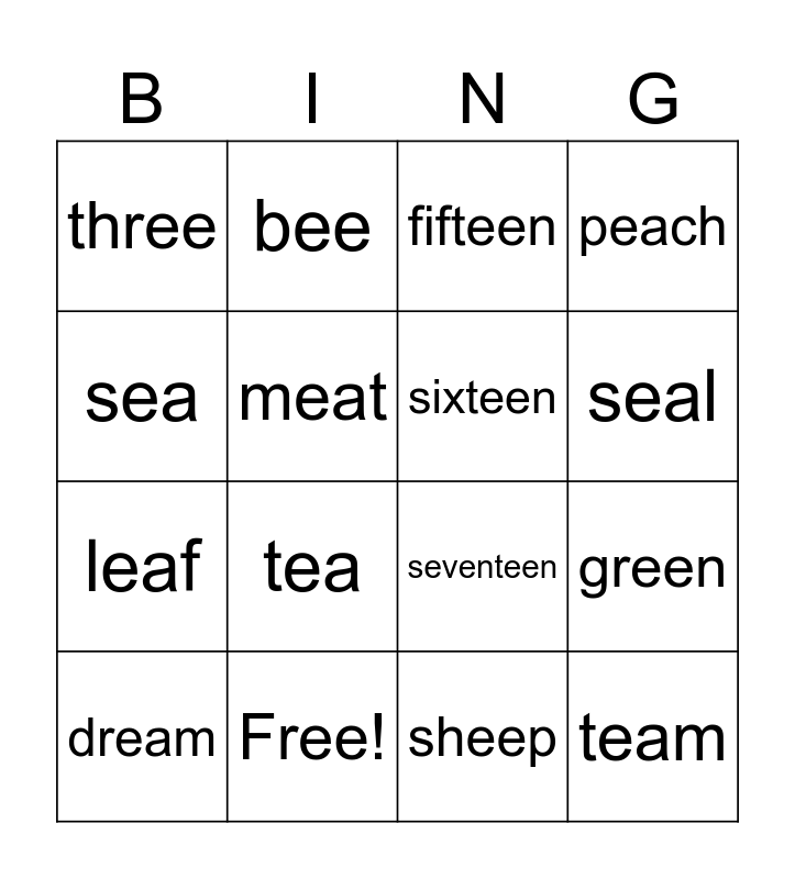This bingo card has 21 words: Free!, tree, bee, beetle, sheep, sixteen, three, fifteen, seventeen, seal, leaf, peach, team, read, meat, speak, dream, tea, sea, green and sneeze.
