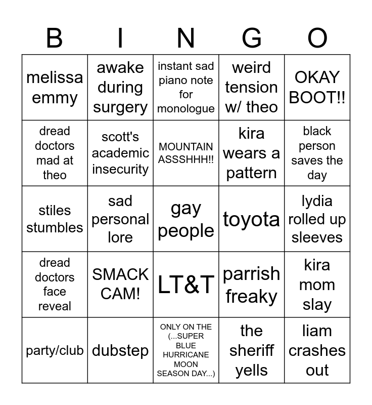 This bingo card has a free space and 24 words: SMACK CAM!, dubstep, MOUNTAIN ASSSHHH!!, party/club, OKAY BOOT!!, melissa emmy, dread doctors mad at theo, awake during surgery, toyota, LT&T, kira wears a pattern, stiles stumbles, parrish freaky, kira mom slay, scott's academic insecurity, the sheriff yells, lydia rolled up sleeves, instant sad piano note for monologue, black person saves the day, sad personal lore, liam crashes out, dread doctors face reveal, weird tension w/ theo and ONLY ON THE (...SUPER BLUE HURRICANE MOON SEASON DAY...).