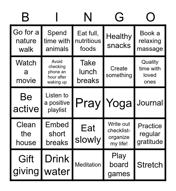 This bingo card has 30 words: Drink water, Go for an ocean dip, Listen to a positive playlist, Bake, Go for a nature walk, Eat full, nutritious foods, Avoid checking phone an hour after waking up, Eat slowly, Yoga, Meditation, Journal, Pray, Play board games, Stretch, Quality time with loved ones, Morning coffee, Write out checklist- organize my life!, Clean the house, Embed short breaks, Book a relaxing massage, Be active, Do nothing!, Spend time with animals, Create something, Watch a movie, Healthy snacks, Practice regular gratitude, Gift giving, Take lunch breaks and Take a mindful minute focusing on your 5 senses.
