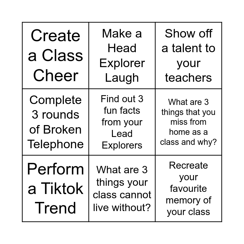 This bingo card has 9 words: Perform a Tiktok Trend, Show off a talent to your teachers, Make a Head Explorer Laugh, Complete 3 rounds of Broken Telephone, Create a Class Cheer, What are 3 things that you miss from home as a class and why?, Find out 3 fun facts from your Lead Explorers, Recreate your favourite memory of your class and What are 3 things your class cannot live without?.