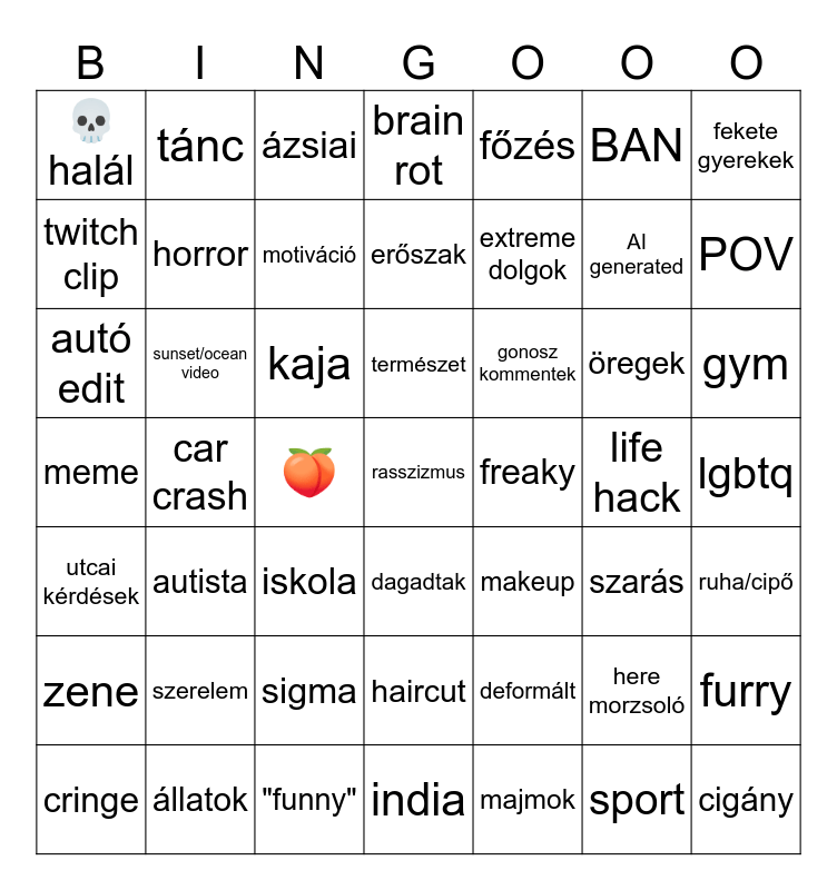 This bingo card has a free space and 48 words: deformált, AI generated, india, car crash, kaja, lgbtq, tánc, állatok, BAN, dagadtak, fekete gyerekek, brain rot, öregek, gonosz kommentek, zene, life hack, twitch clip, POV, here morzsoló, főzés, extreme dolgok, 🍑, 💀halál, horror, furry, motiváció, gym, cringe, természet, sunset/ocean video, sport, freaky, ruha/cipő, szerelem, meme, makeup, szarás, autó edit, iskola, sigma, utcai kérdések, cigány, ázsiai, "funny", erőszak, haircut, autista and majmok.